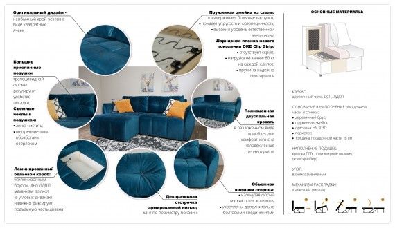 Универсальность: Угловая часть дивана может быть переставлена на левую или правую сторону, что удобно при частых перестановках.