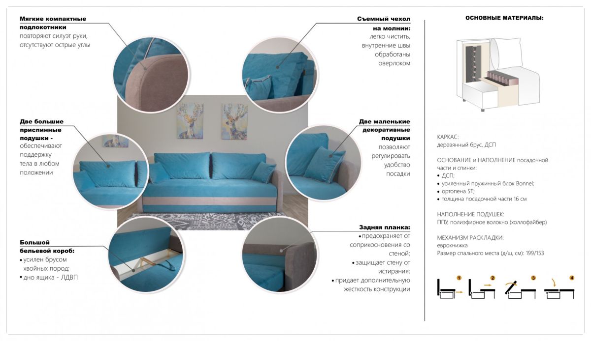Диван "Бостон" - это современная модель, сочетающая в себе оригинальный дизайн и высокий уровень комфорта. Плотная посадочная часть дивана и мягкие приспинные подушки со съемными чехлами обеспечат для Вас полноценный отдых. В ящик для хранения белья можно поместить постельные принадлежности, что значительно сэкономит место в шкафу. Деревянный каркас из бруса хвойных пород надежен в эксплуатации и имеет долгий срок службы, а пружинный блок "Bonnell" выдерживает большие нагрузки, бесшумен и устойчив к деформации. Благодаря своим компактным размерам и мягкой обивочной ткани, модели "Бостон" найдется место в любой комнате.