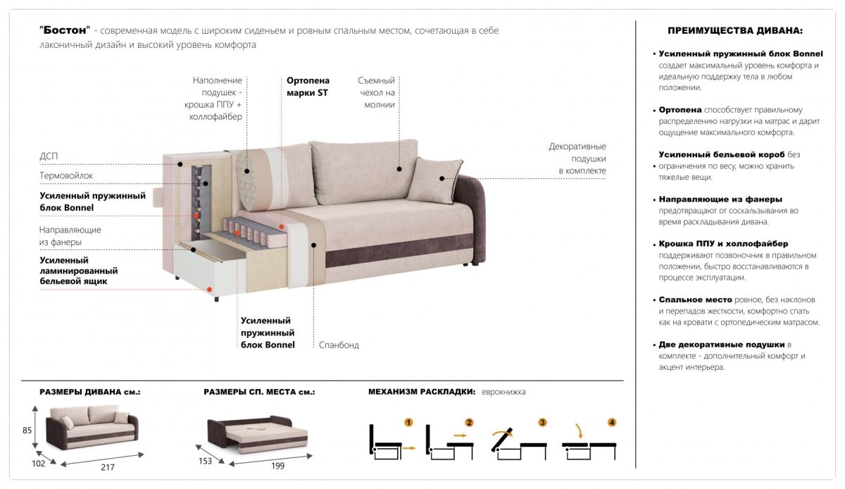 Диван "Бостон" - это современная модель, сочетающая в себе оригинальный дизайн и высокий уровень комфорта. Плотная посадочная часть дивана и мягкие приспинные подушки со съемными чехлами обеспечат для Вас полноценный отдых. В ящик для хранения белья можно поместить постельные принадлежности, что значительно сэкономит место в шкафу. Деревянный каркас из бруса хвойных пород надежен в эксплуатации и имеет долгий срок службы, а пружинный блок "Bonnell" выдерживает большие нагрузки, бесшумен и устойчив к деформации. Благодаря своим компактным размерам и мягкой обивочной ткани, модели "Бостон" найдется место в любой комнате.