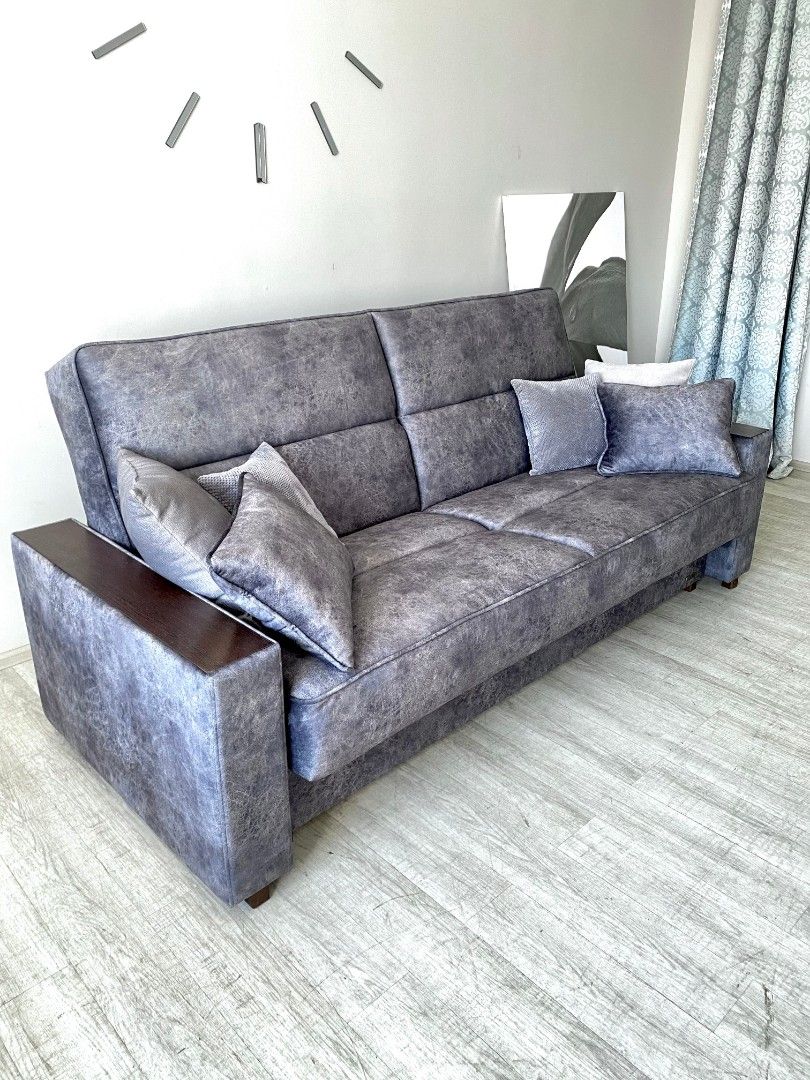 ортопедический диван, ламинированный декор подлокотников, легкое раскладывание, вместимый короб