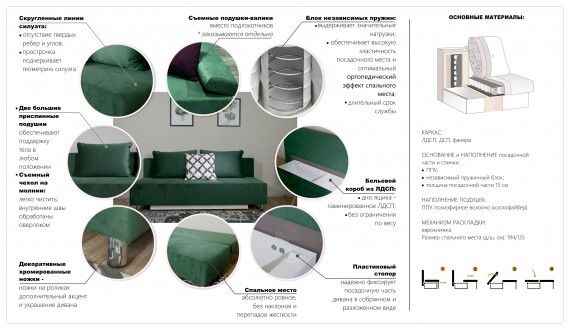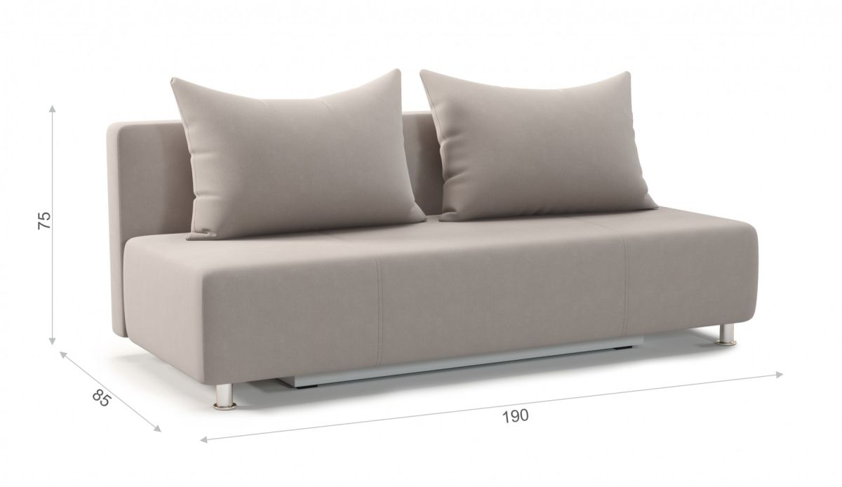 Функциональный и компактный диван с лаконичным дизайном и нейтральной обивкой отлично дополнит современную обстановку. Две большие приспинные подушки обеспечивают поддержку тела в любом положении. Диван легко трансформируется в кровать с ортопедическим матрасом на независимом пружинном блоке в основании, что способствует здоровому и комфортному сну. В бельевом ящике удобно хранить постельные принадлежности.