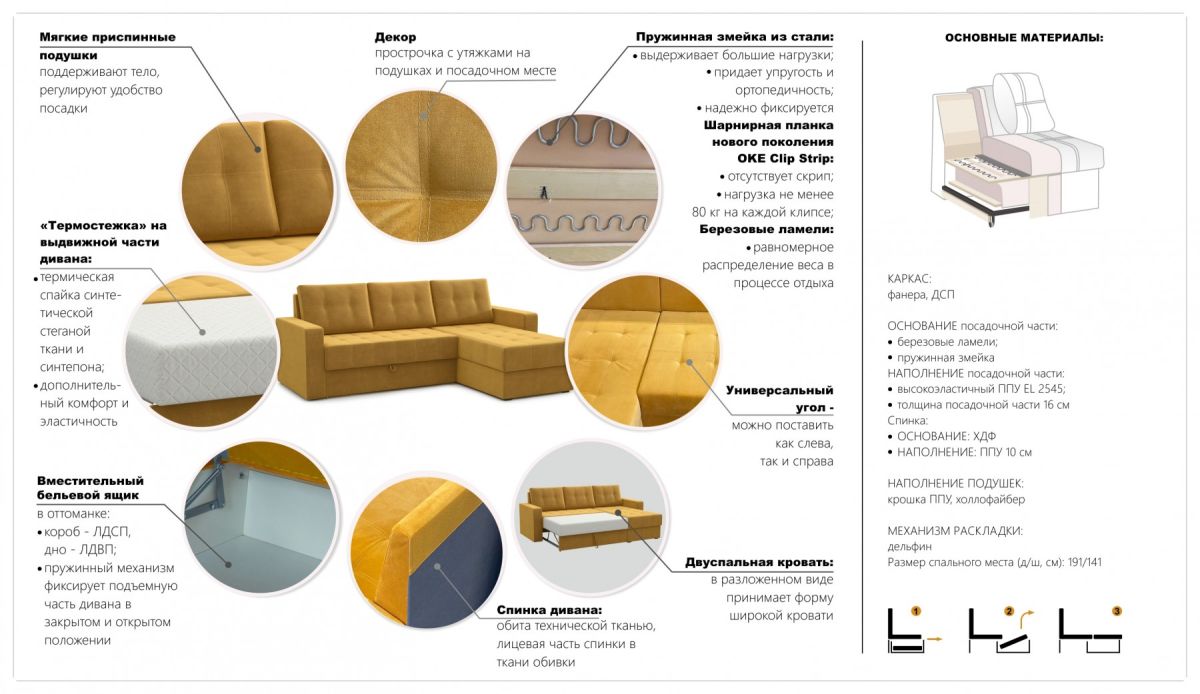 Стильный и компактный угловой диван с классической прострочкой и нейтральным цветом обивки подойдет для любого интерьера гостиной или спальни. Надежный механизм дельфин преобразует диван в удобное и просторное спальное место. Вместительный бельевой короб в оттоманке удобен для хранения постельных принадлежностей или сезонной одежды. Универсальный угол позволит определить его нужное положение при сборке.