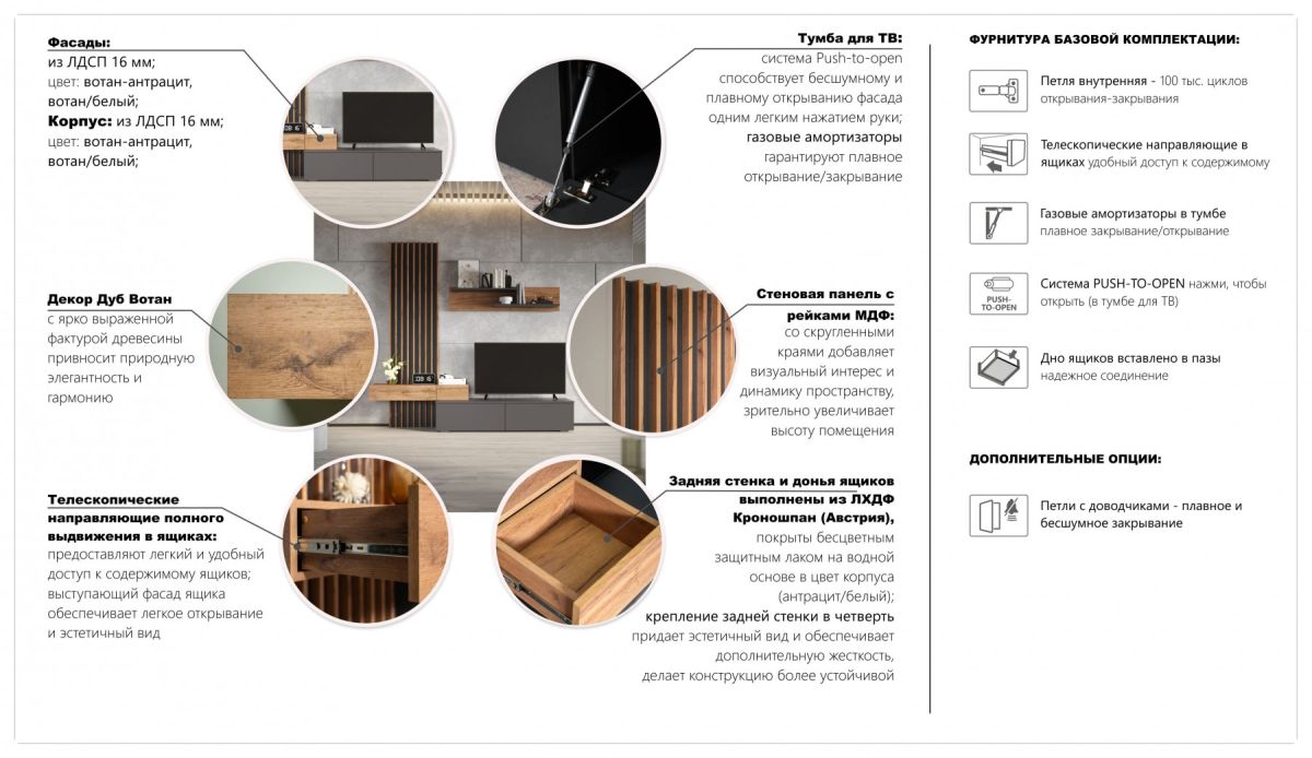 ✔ Система "push-to-open" — открывание тумбы легким нажатием