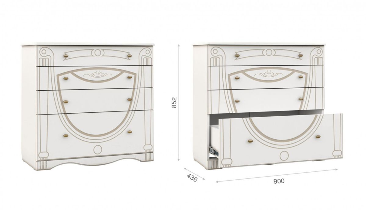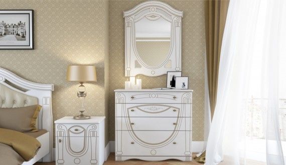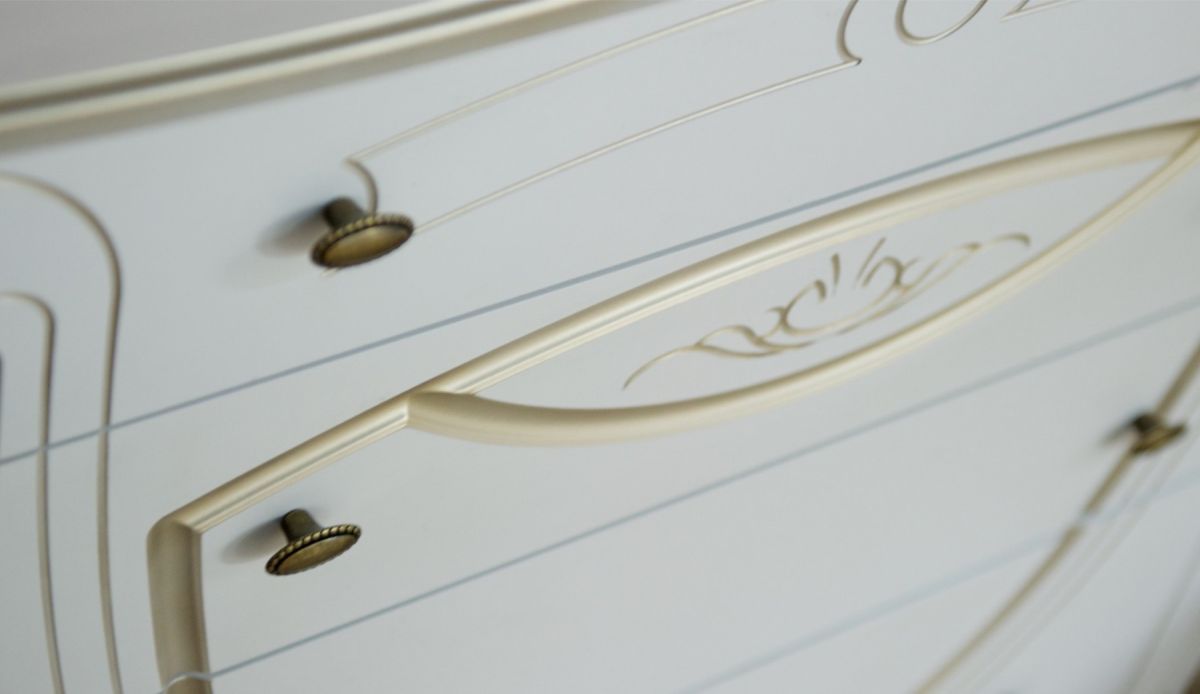 Комод Александрина выполнен в классическом итальянском стиле - олицетворение гармонии, сочетание роскоши и величия, спокойствия и уюта. Крашеные фасады из МДФ декорированы мотивом классической архитектуры «Античная лира» и изображением колонн по краям модуля. Крышка комода выполнена из МДФ со скругленными краями, ящики на телескопических направляющих полного выдвижения для удобного доступа ко всему содержимому.