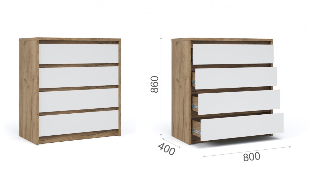 Современный функциональный комод «Мишель» с четырьмя выдвижными ящиками обеспечит удобное хранение одежды, предметов декора, книг, посуды. Современные цвета декора корпуса и белоснежный фасад добавят в жилое помещение света, уюта и комфорта. Отсутствие лицевой фурнитуры в ящиках подчеркивает минимализм дизайна. Благодаря простоте форм и классической расцветке подходит для многих интерьеров.