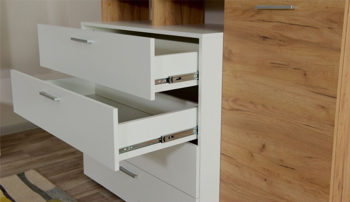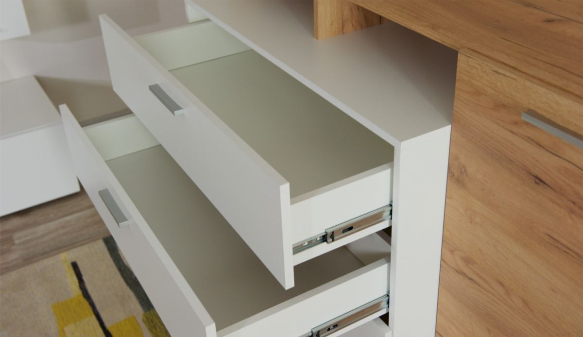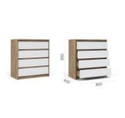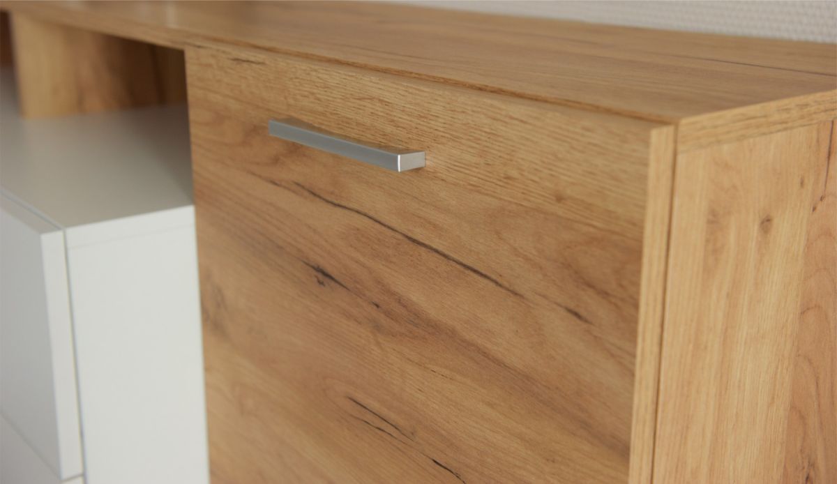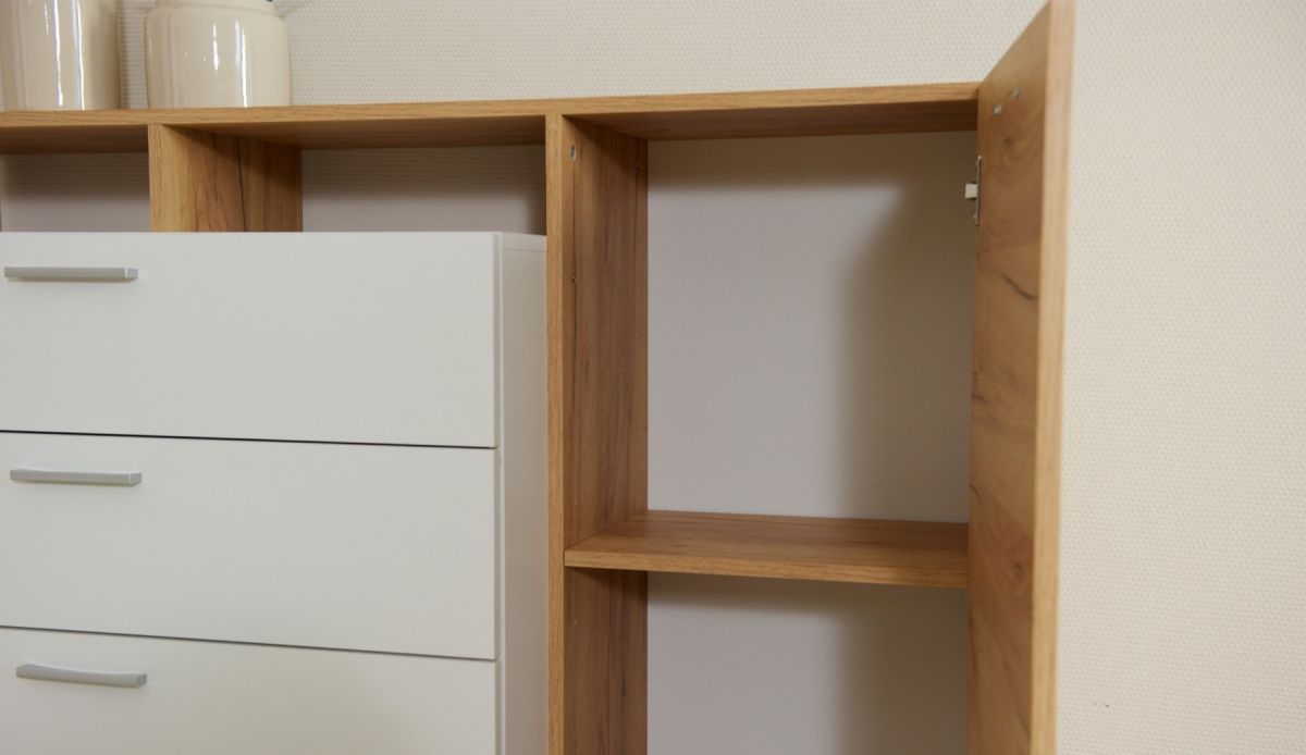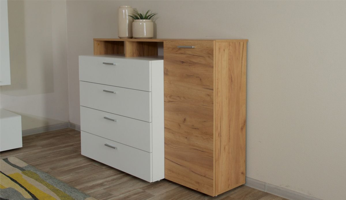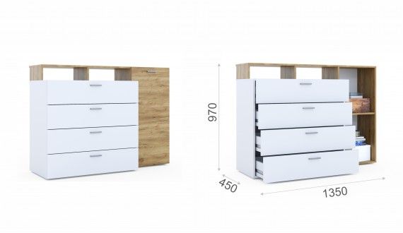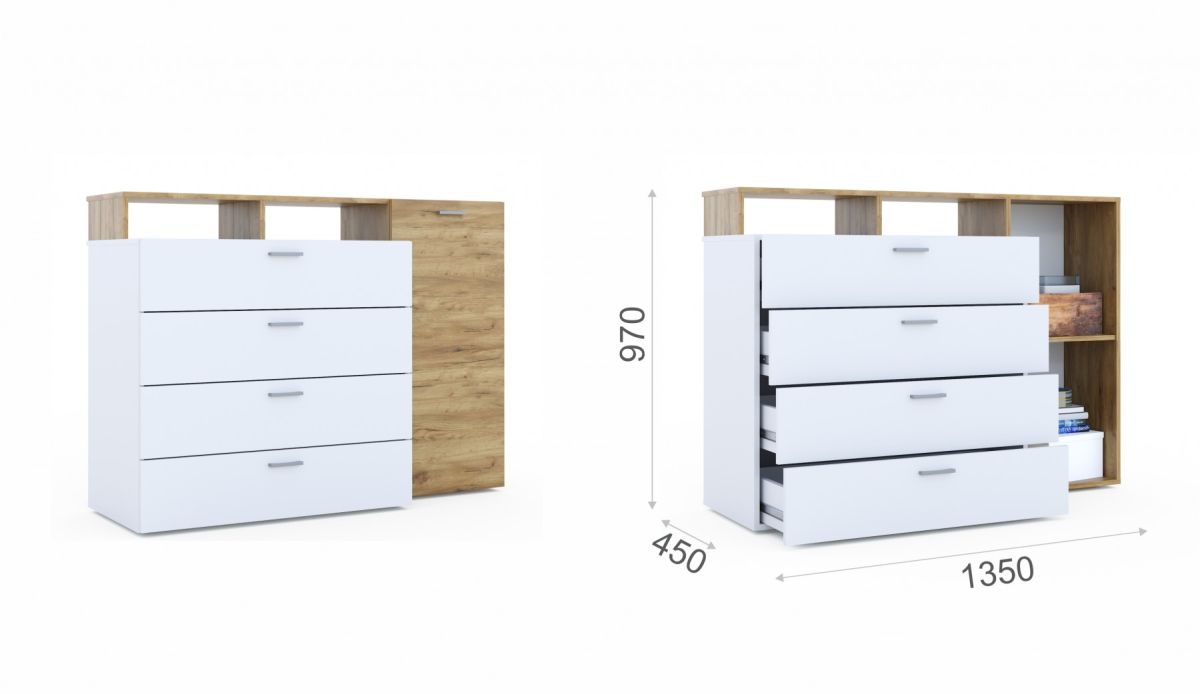 Оригинальный комод Невио – 1 станет незаменимым предметом интерьера в Вашем доме. Яркое сочетание белого цвета с теплым древесным позволит сочетать его с другими предметами мебели и декора, создавать яркие и разнообразные интерьеры. Комод оснащен вместительными ящиками полного выдвижения, открытыми и закрытыми полками. Верхняя крышка комода увеличена на 1см, что обеспечивает эстетичный вид сверху. Мебель выполнена из высококачественных экологичных материалов.