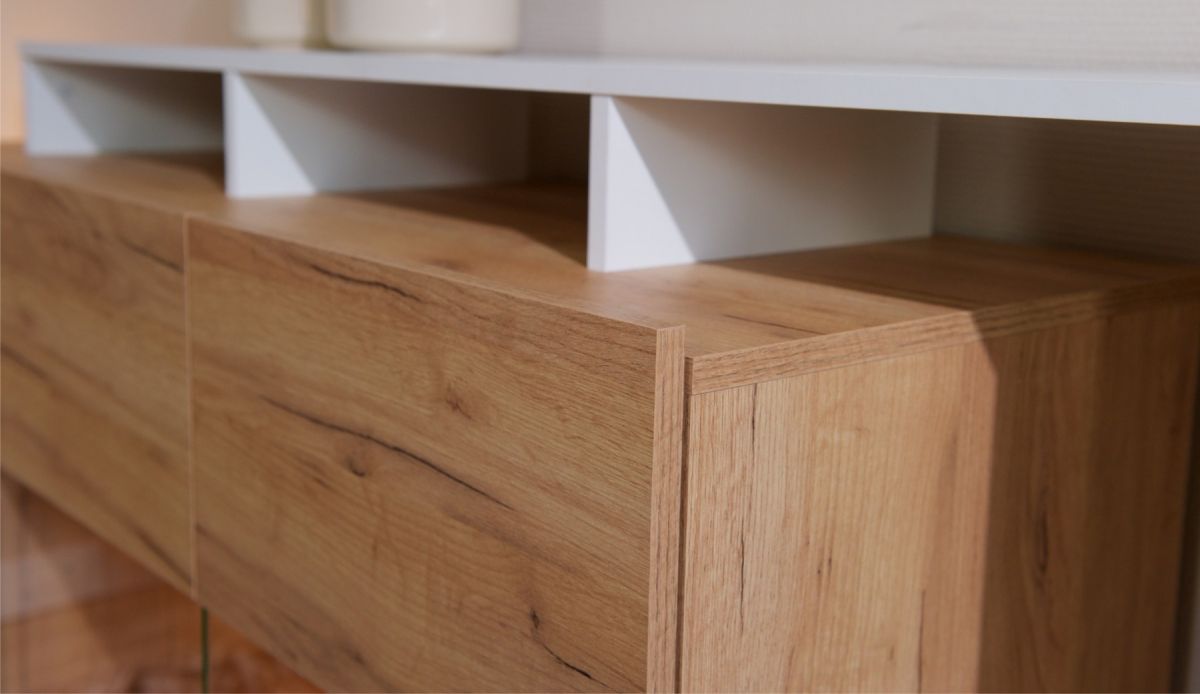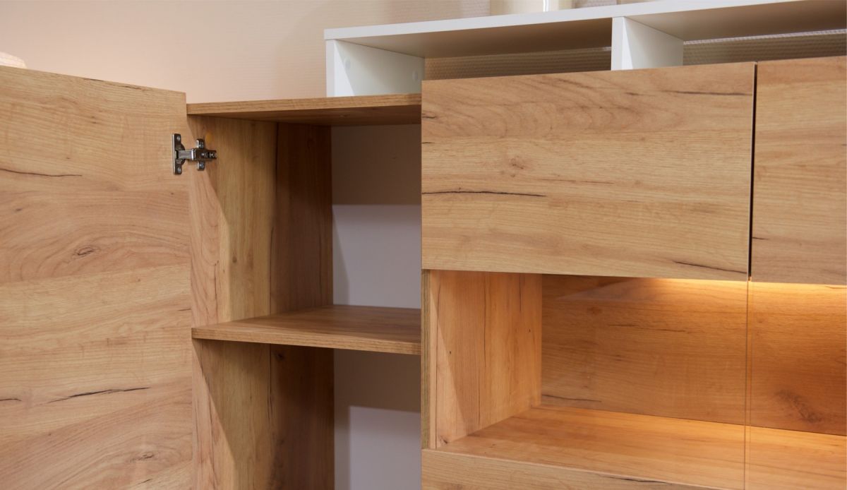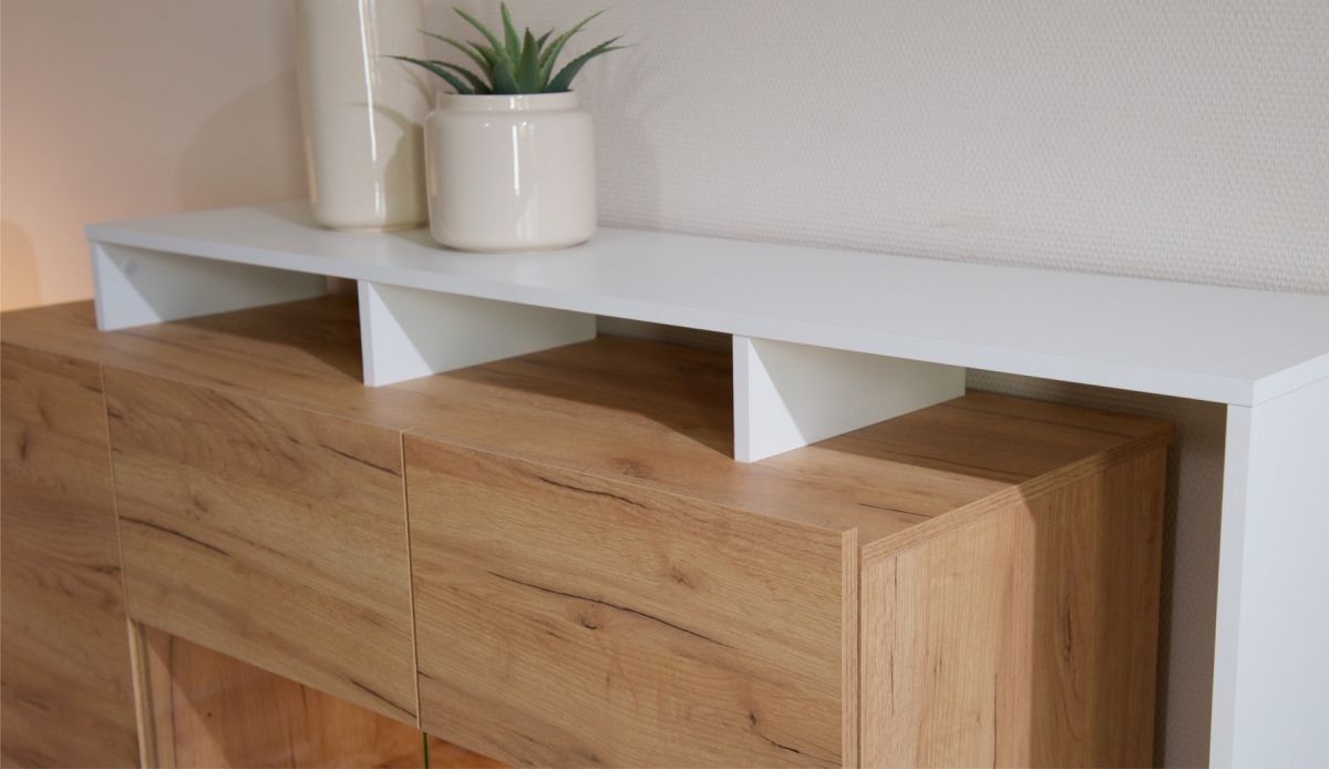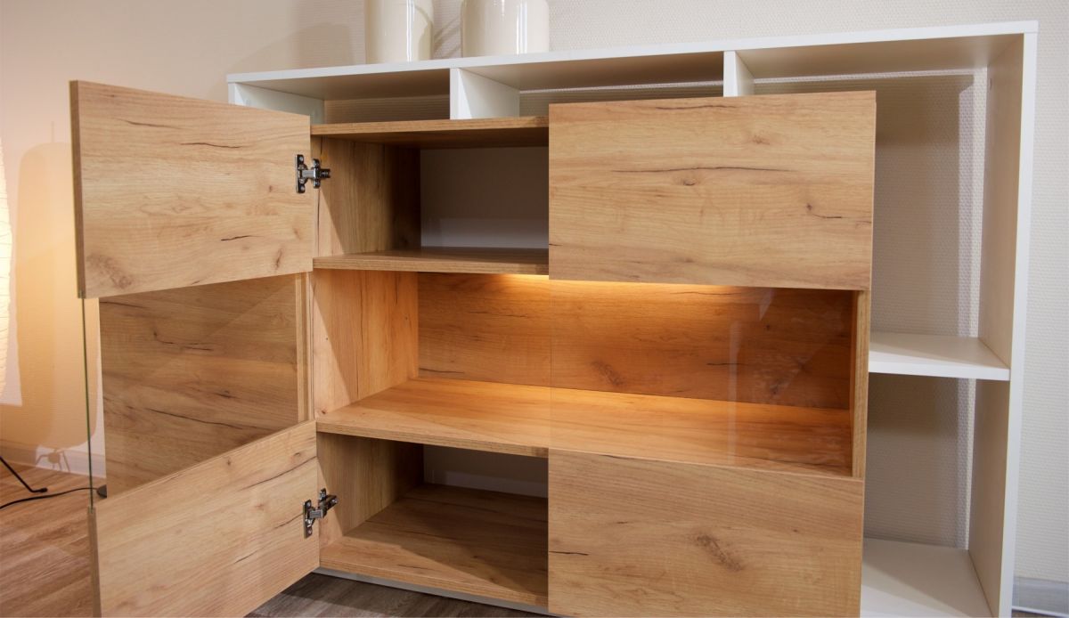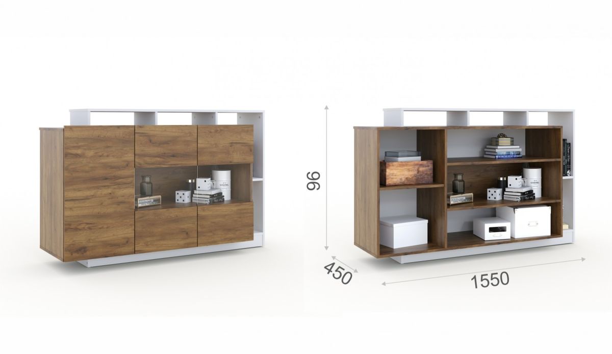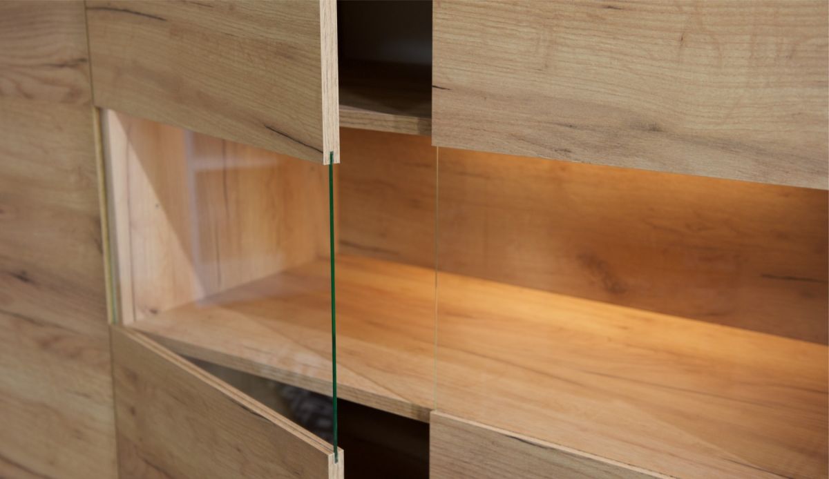 Красивый и практичный комод Невио - 2 обладает целым рядом преимуществ. Благодаря оригинальным открытым и закрытым полкам, отсутствию лицевой фурнитуры создает ощущение легкости и невесомости. Высота фасадов увеличена на 1 см для удобства открывания. С помощью витрины из прозрачного стекла Вы можете украсить свой дом милыми сердцу вещами и сделать на них акцент с помощью светодиодной подсветки. Задняя стенка витрины выполнена из ЛДСП в цвет корпуса, поэтому не будет отвлекать на себя внимание от наполнения витрины. Мебель выполнена из высококачественных экологичных материалов.