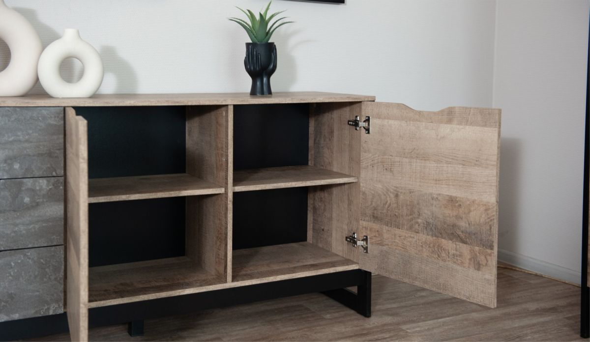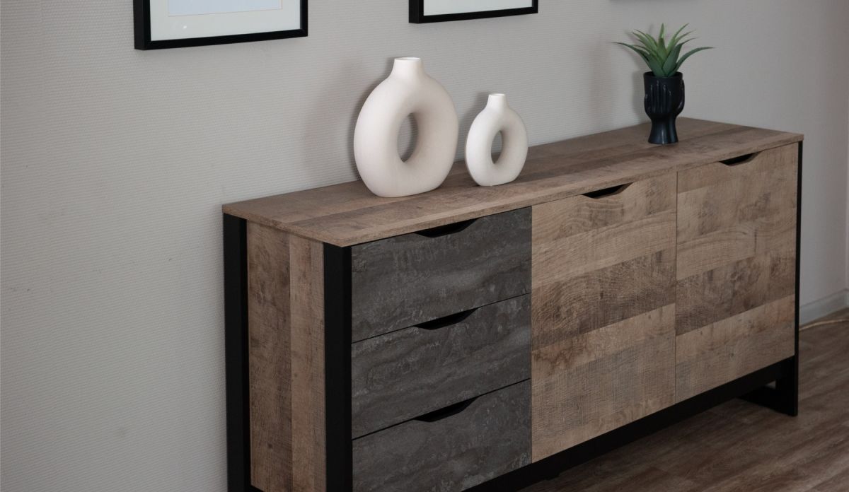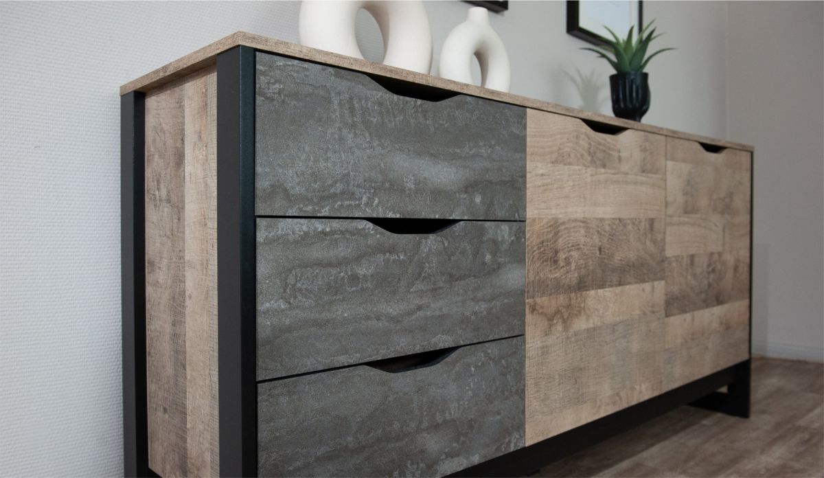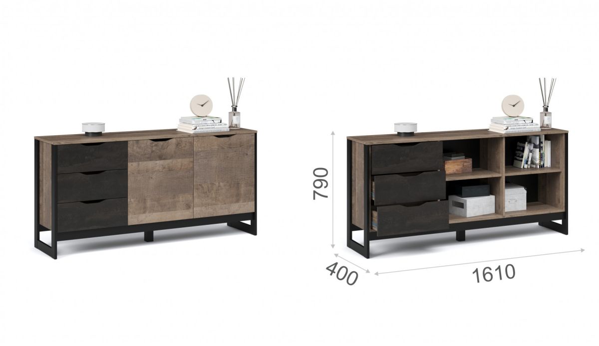 Функциональный вместительный комод в стиле лофт, оснащен тремя ящиками на телескопических направляющих и закрытыми полками для хранения вещей и аксессуаров. Отсутствие лицевой фурнитуры подчеркивает минимализм и геометрию модуля. Особенность дизайна – это сочетание реалистичных по цвету и тактильности трендовых декоров, которые соответствуют последним городским тенденциям. «Дуб Гранж» привлекает имитацией вручную обработанного дерева и выразительной зернистой текстурой, характерной формой досок. Стильный серый цвет «Железного камня» с металлическими разводами и новая текстура состаренной штукатурки в сочетании с гладкостью металла вносят индустриальныи? колорит. Оригинальные ножки-опоры из МДФ контрастного цвета придают изюминку интерьеру.