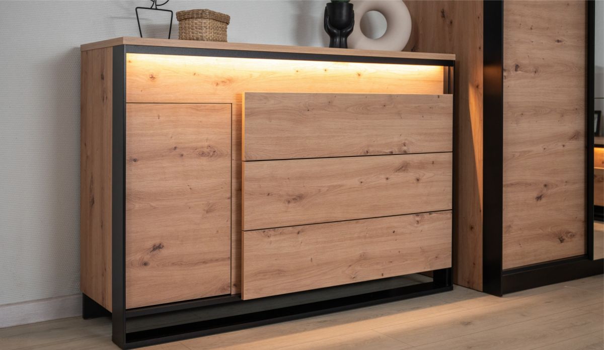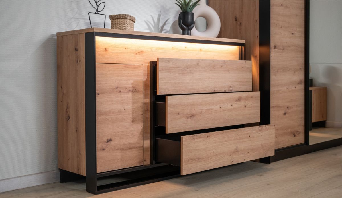 Для производства комода используются плиты Kronospan австрийского происхождения, соответствующие высоким европейским экологическим стандартам (класс эмиссии E0.5). Это гарантирует безопасность для здоровья всех членов семьи, включая детей и аллергиков.