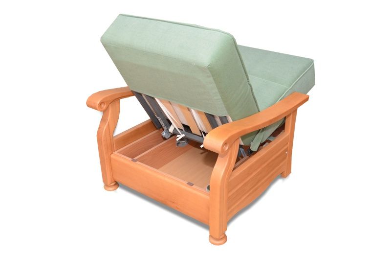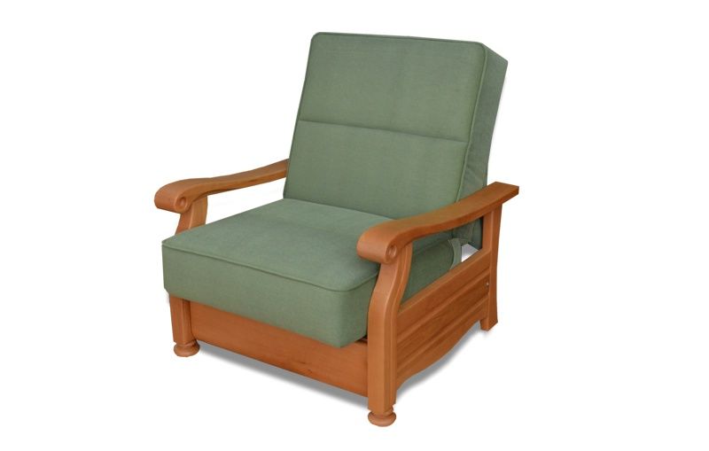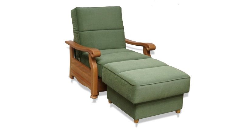 Ортопедическое основание имеет три положения наклона спинки, в комплекте с пуфом получается полноценное спальное место. Локти и царга из ценных пород дерева (бук) в цвете: орех темный, натуральный бук под масло