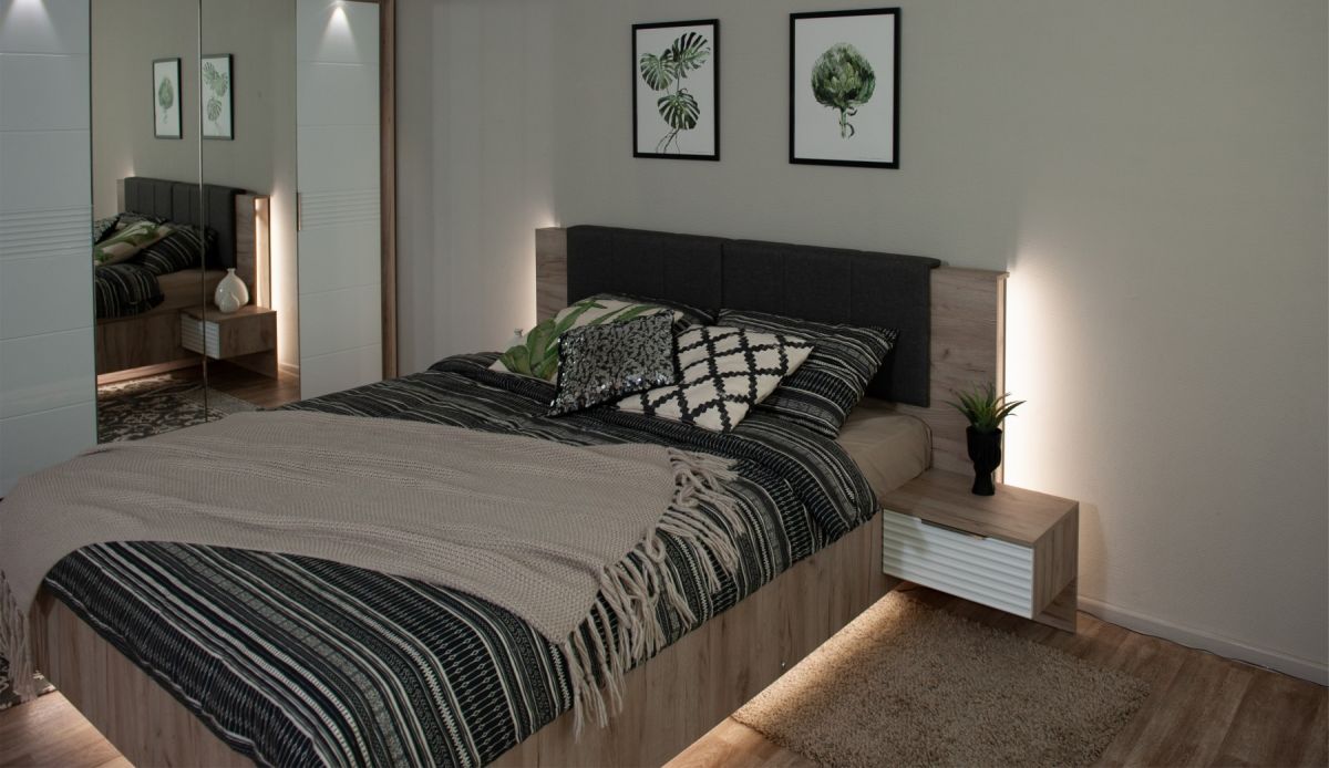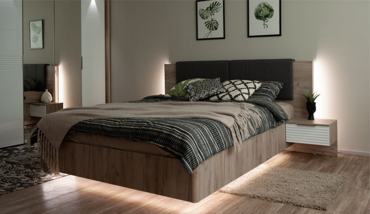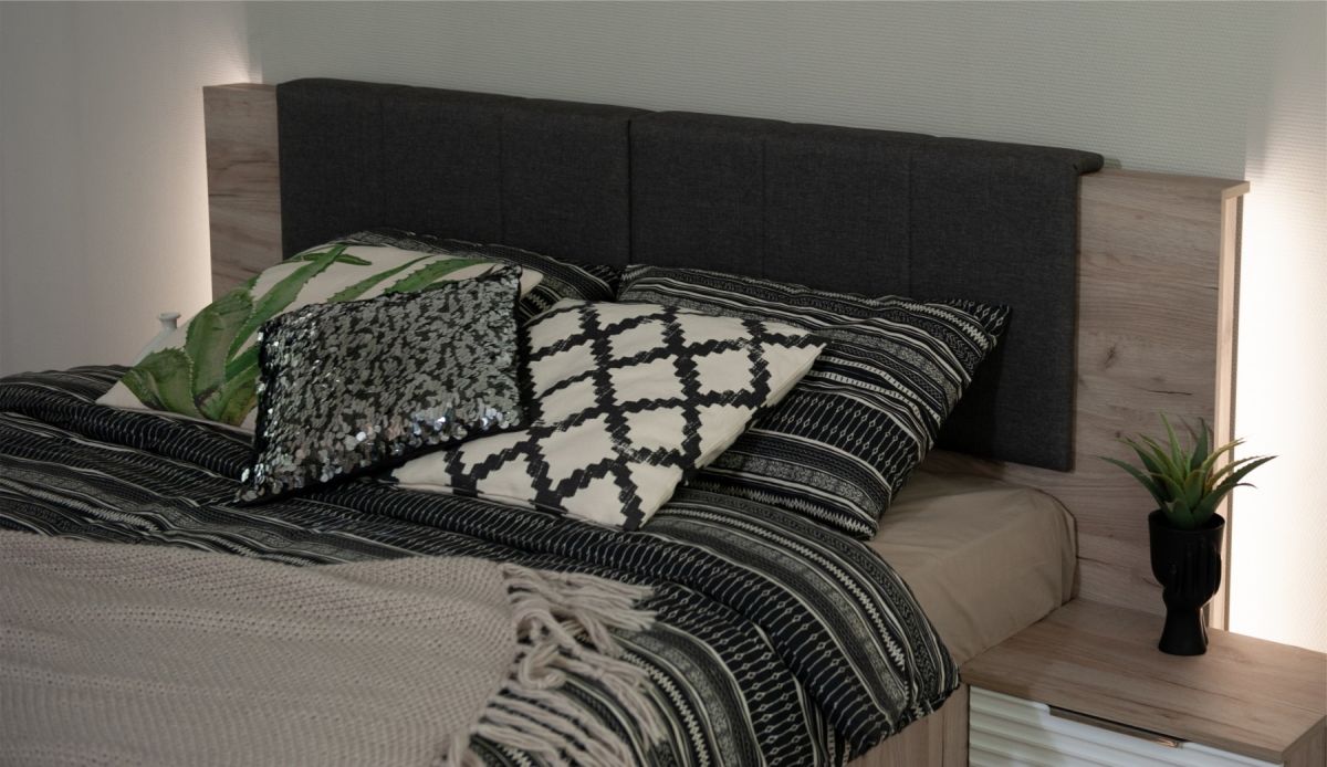«Парящая в воздухе» кровать Джулия – это новинка современного рынка, выполнена в простых и лаконичных формах. Комбинированное изголовье из ЛДСП с мягкой накладкой - удобная, уютная и красивая деталь дизайна, позволит комфортно проводить время в кровати. Рамка по краям со светодиодной подсветкой служит дополнительным освещением в ночное время и создает романтическое настроение.Трапециевидные ножки расположены ближе к центру конструкции и практически не видны, в сочетании со светодиодной подстветкой по периметру создают "эффект парения".