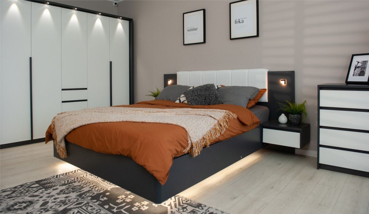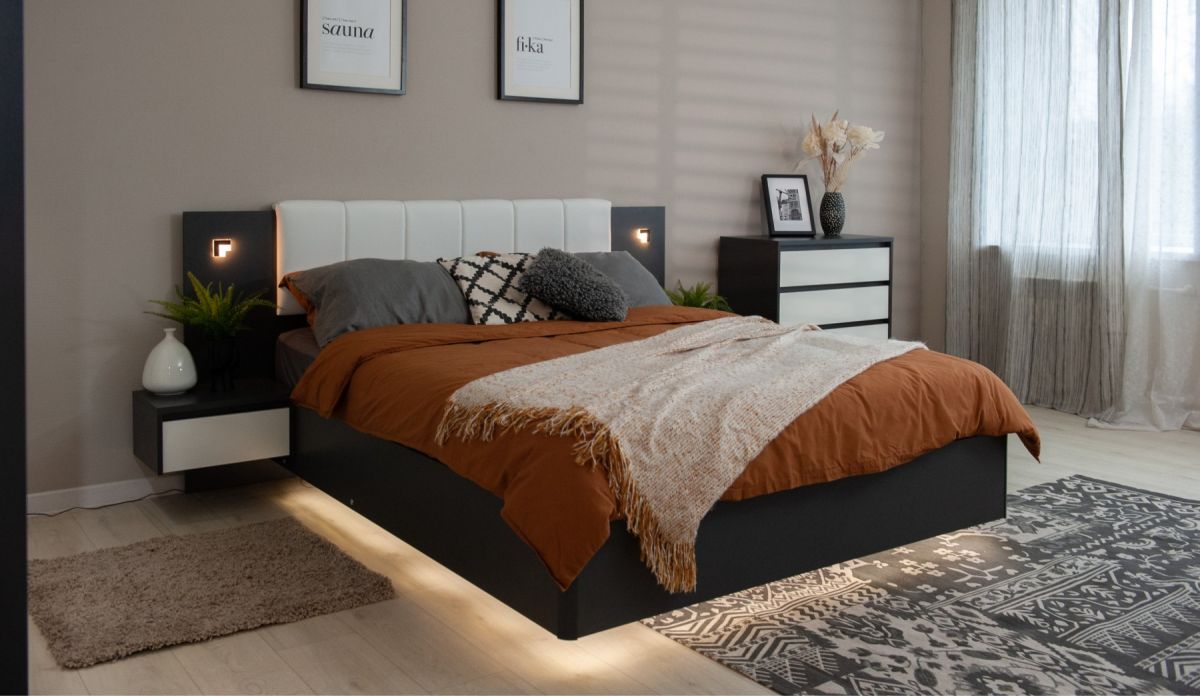 «Мишель» – это современная кровать в актуальных природных цветах с оригинальной конструкцией основания, которое в сочетании с подсветкой создает «эффект парения». Накладные светильники в комбинированном изголовье и подсветка по его периметру дают дополнительное освещение в ночное время, а мягкая накладка с вертикальной отстрочкой комфортно поддерживает спину во время отдыха.