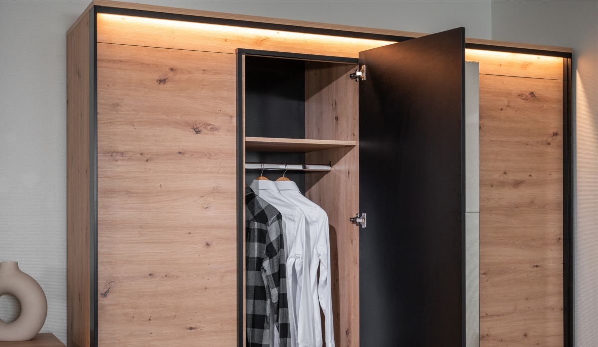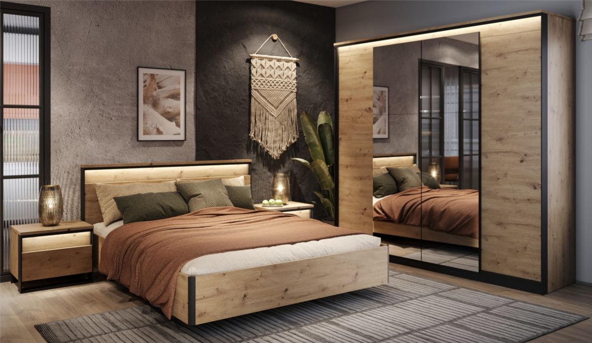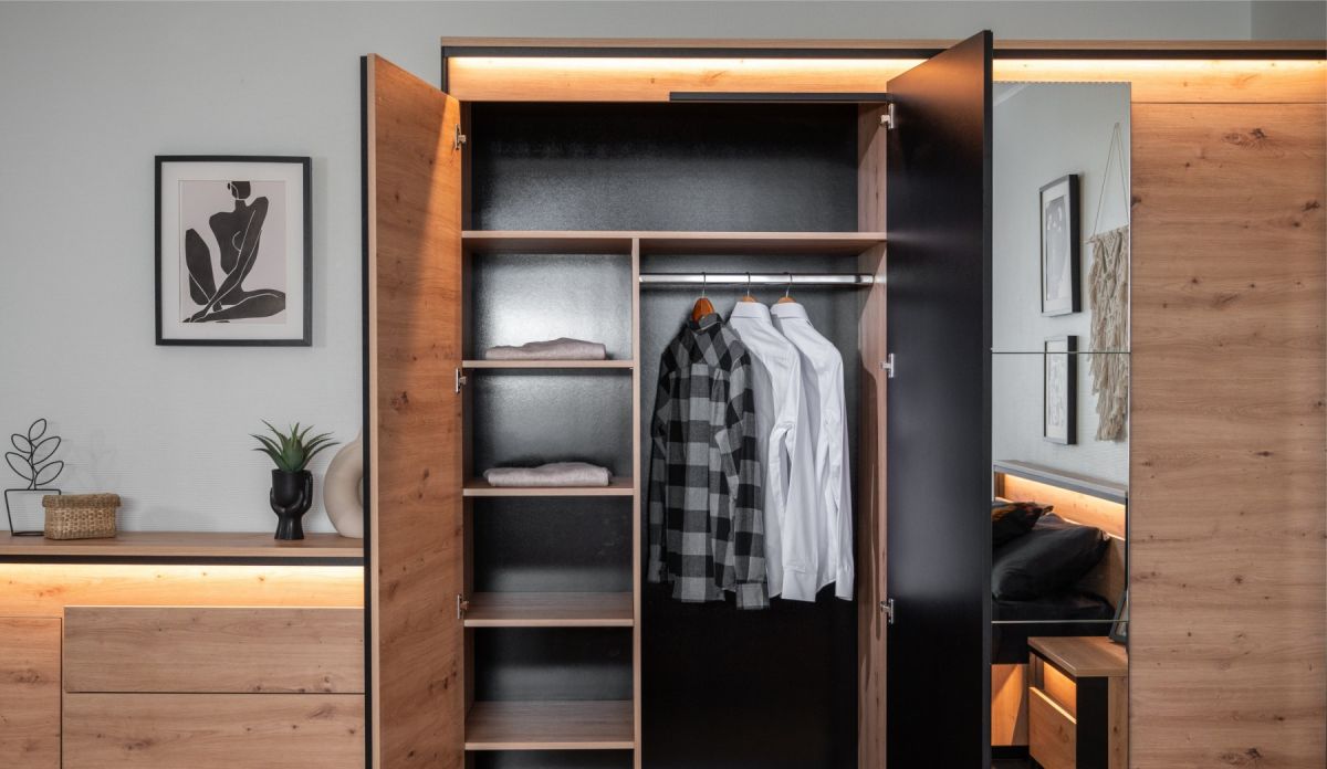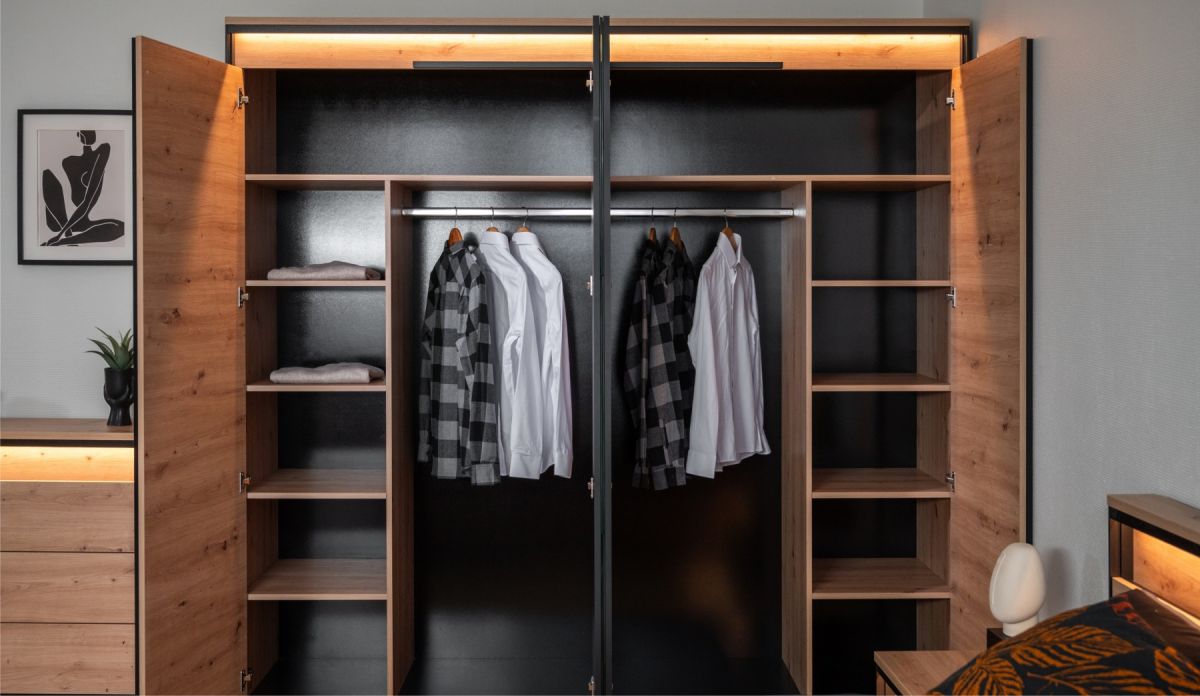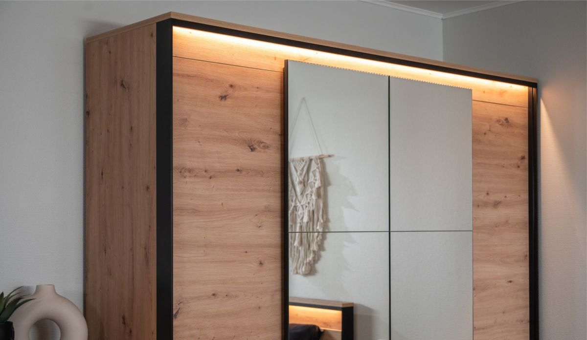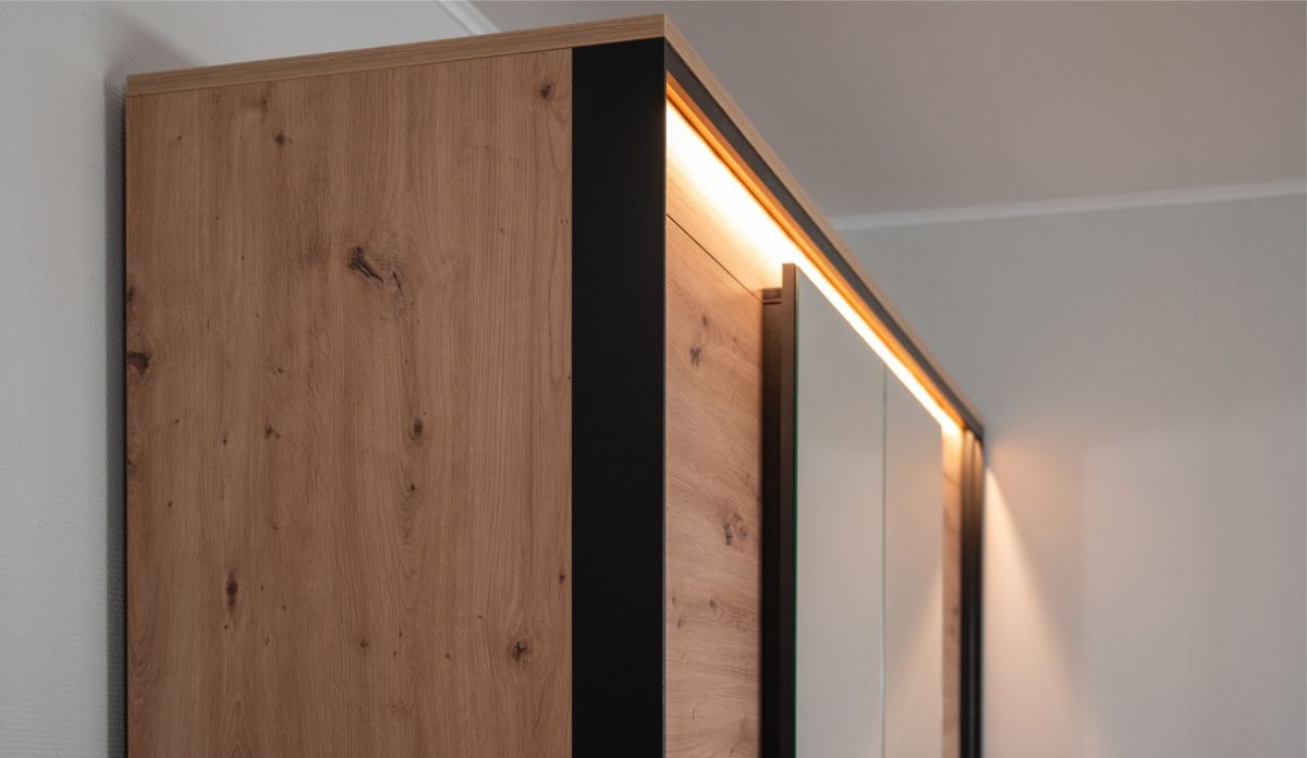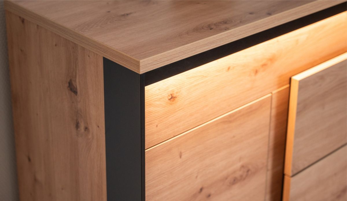 LED-подсветка: Дополнительная опция. Встроенная светодиодная подсветка мягко подсвечивает фасады, создавая уютную атмосферу и выгодно подчеркивая уникальный рельеф мебели.
