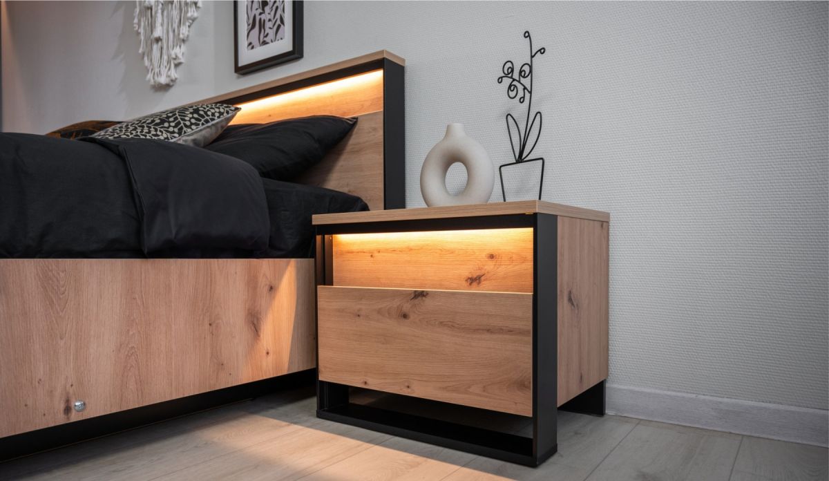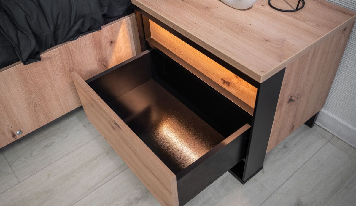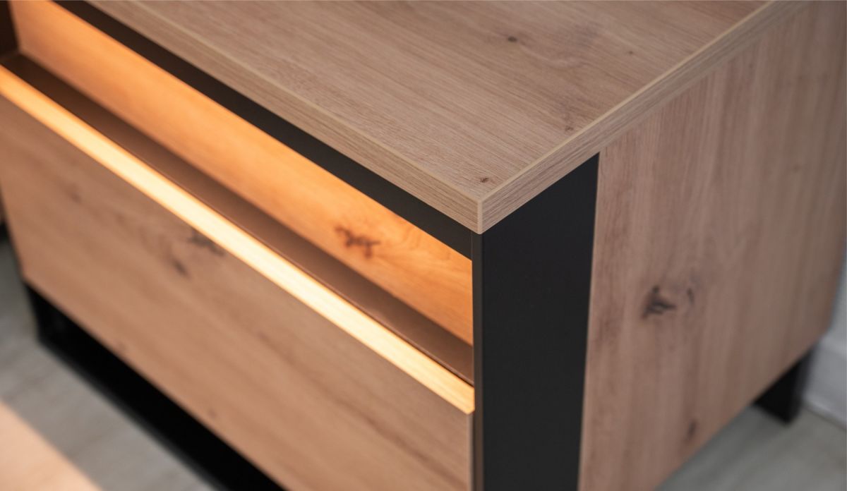 Выразительная текстура: Натуралистичная и рельефная текстура древесины дуба Онтарио на фасадах и корпусе наполняет комнату уютом и теплом.