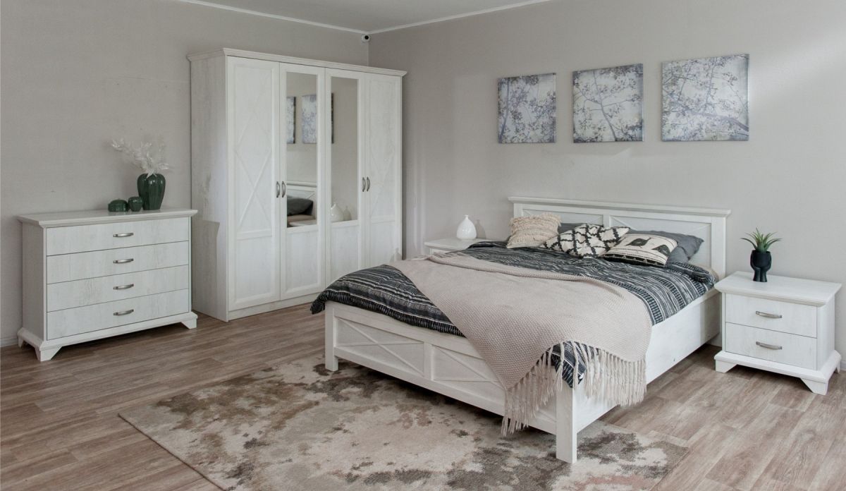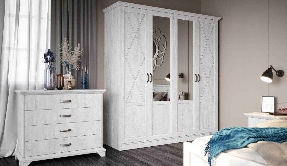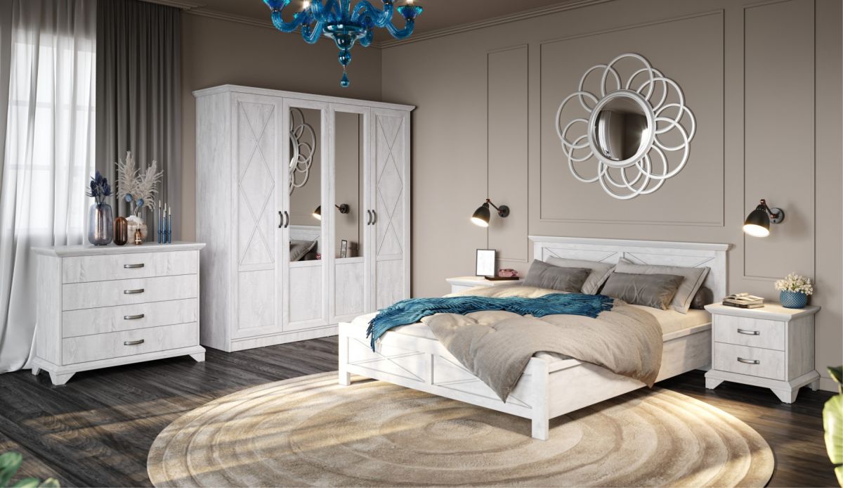 Спальня Лорена в стиле неоклассика выглядит как островок безмятежности и покоя. Благодаря фасадам с фактурой и рисунком натурального светлого дерева буквально наполнена свежестью и гармонией. Изюминка декора спальни – декоративные крестообразные накладки на рамочных фасадах шкафа и в изголовье кровати. Выступающие карнизы всех элементов, фигурные ножки и цоколь подчеркивают стилистику коллекции, а металлические ручки оттенка старого серебра делают силуэт модулей гармоничным и завершенным. Интерьер спальни Лорена способствует расслаблению, улучшению настроения, прекрасно подойдет как для загородного дома, так и для городской квартиры. Изделия из набора «Лорена» позволяют легко скомпоновать мебель как для спальни, так и для гостиной.