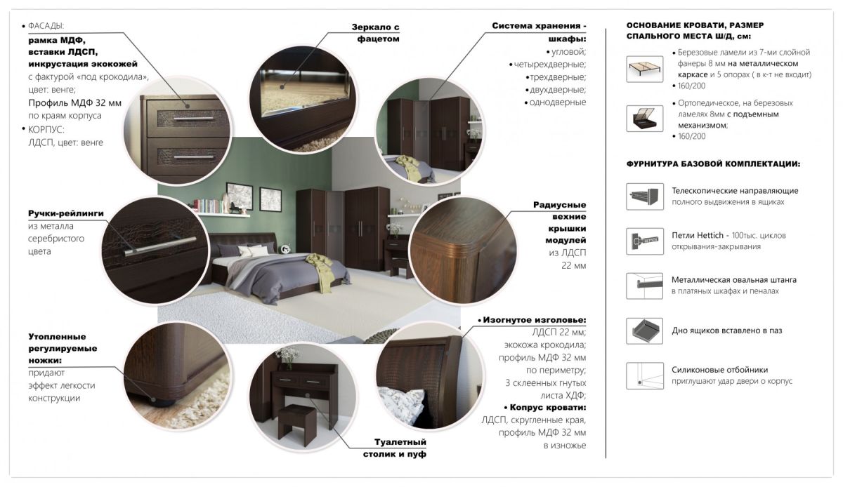 Спальня Токио идеальное сочетание лаконичности японского стиля и функциональности, необходимой для нашего климата. Темный цвет Венге, предельно простые линии, плавные, без острых углов контуры внешних очертаний, эффектные вставки из эко-кожи - все это отражение базовых смыслов фен-шуй. По фен-шуй отсутствие острых углов исключает скопление негативной энергии, направленной на людей, что особенно важно для спальни, где мы беззащитны и проводим основное время нахождения дома. Система Токио разрабатывалась специалистами фен-шуй и в полной мере учитывает все базовые принципы, создавая своими формами гармоничное пространство в комнате, а кожа крокодила, как известно, притягивает деньги. Несмотря на то, что японский стиль ассоциируется с минимализмом Токио - это полноценная и объемная система хранения, а широкий выбор модулей позволяет организовать хранение под любые нужды.