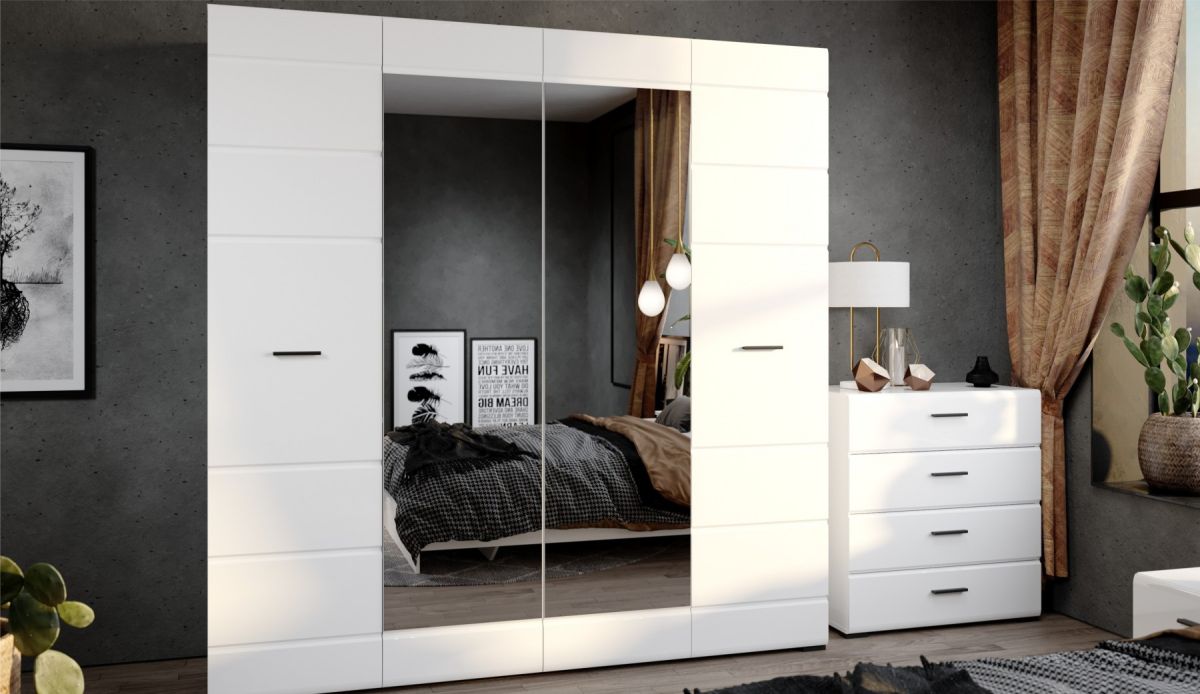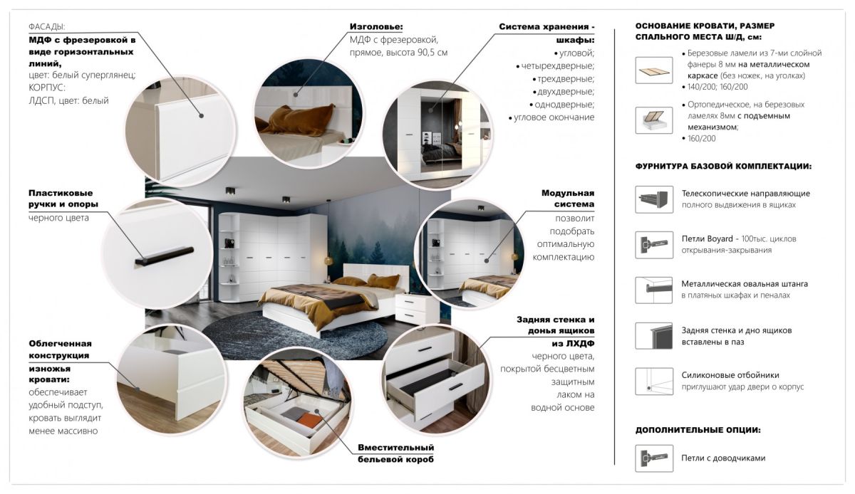 Спальня Йорк отличается стильным европейским дизайном. Глянцевые белые фасады High Gloss из МДФ отражают световые потоки, спальня выглядит динамично, воздушно и легко, что актуально для небольших помещений. Строгая горизонтальная фрезеровка украшает фасады, а контрастные черного цвета ручки и задняя стенка делают спальню особенно выразительной. Спальня универсальна, сочетается с любой мебелью и отделкой. Состоит из отдельных модулей, благодаря чему можно легко подобрать мебель для комнаты любого размера. Выполнена из экологически безопасных и надежных материалов.