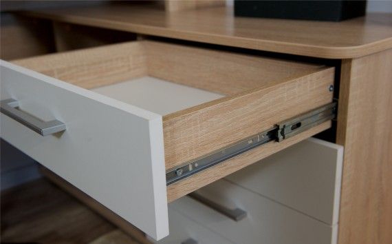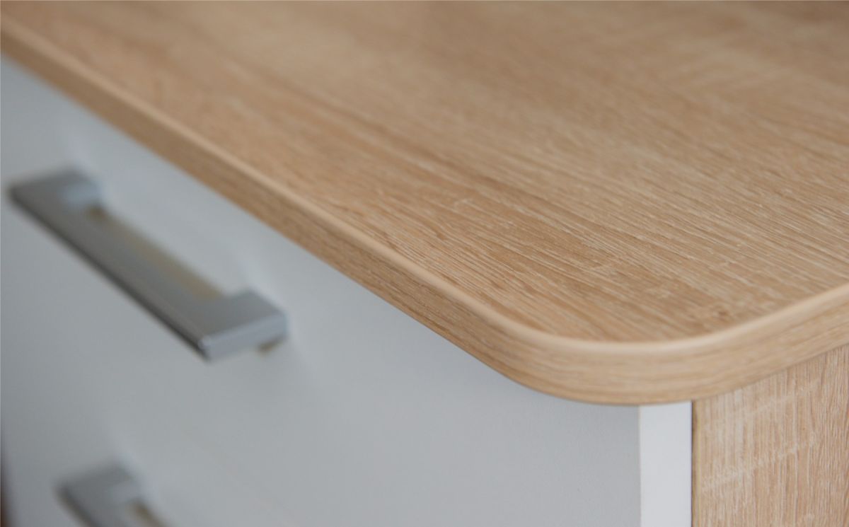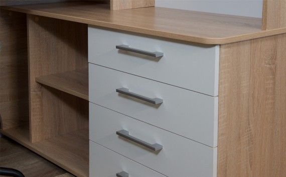 Столы системы Гарвард имеют мягкие и удобные края, с кромкой в 2 мм, а также скруглённые углы столешницы. Корпус выполнен в тёплом древесном цвете светлого дуба с приятной на ощупь фактурой. Фасады — белые матовые. Нейтральные оттенки мебели позволят ей легко вписаться в уже готовый интерьер.