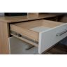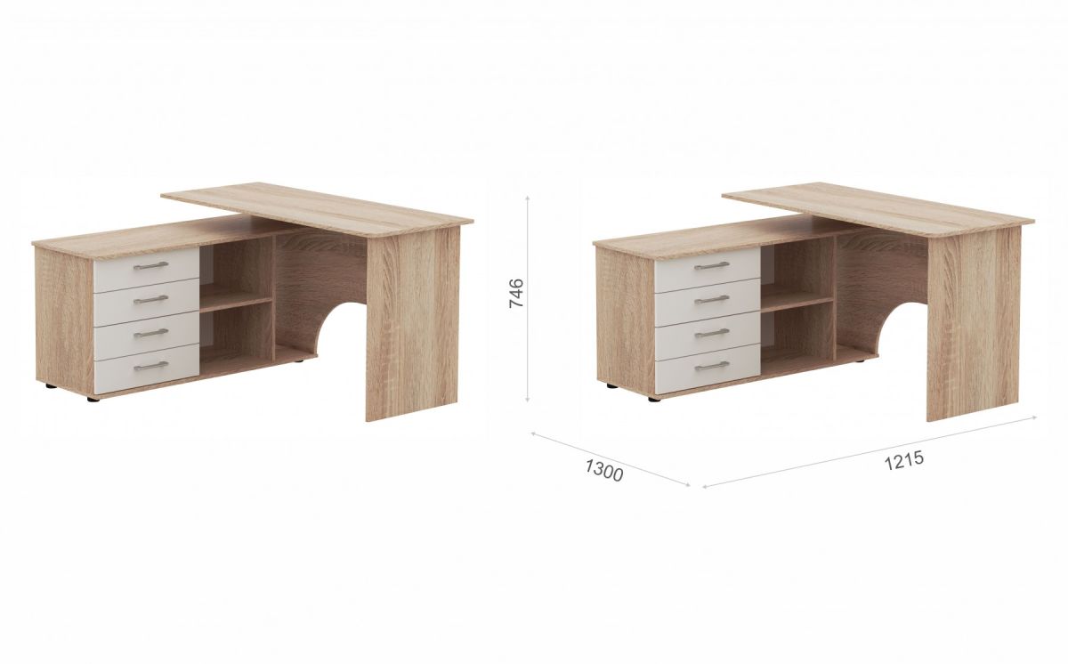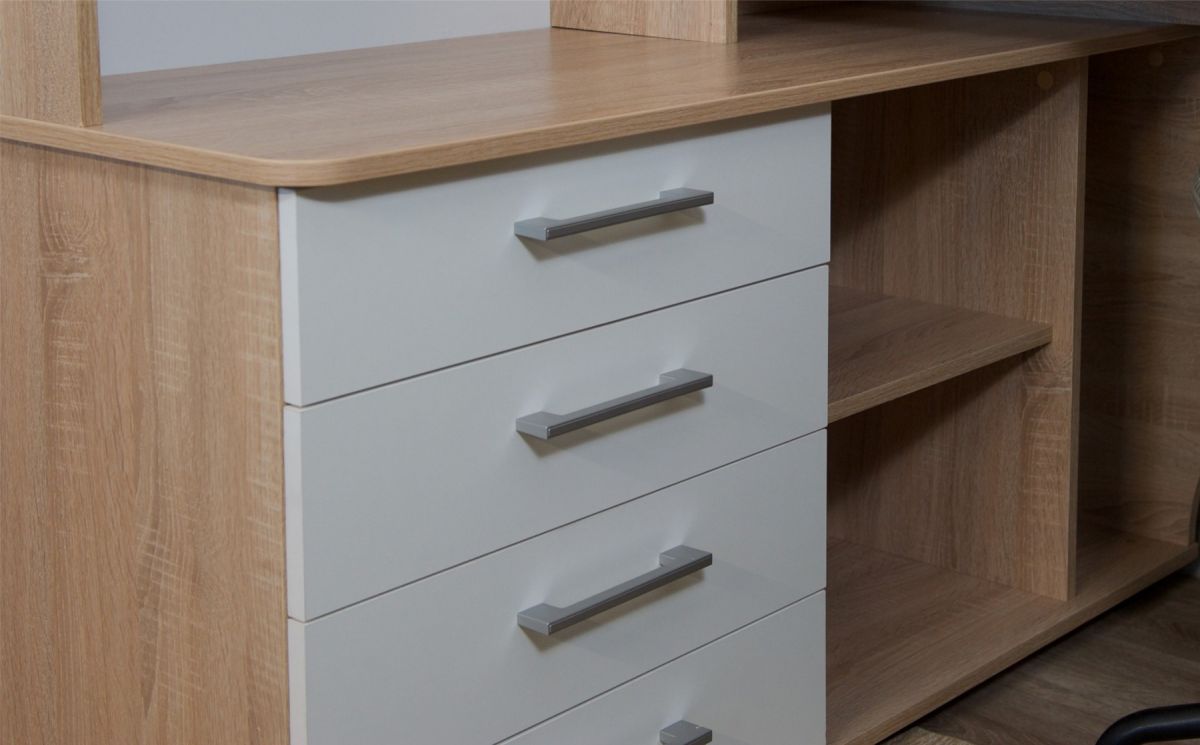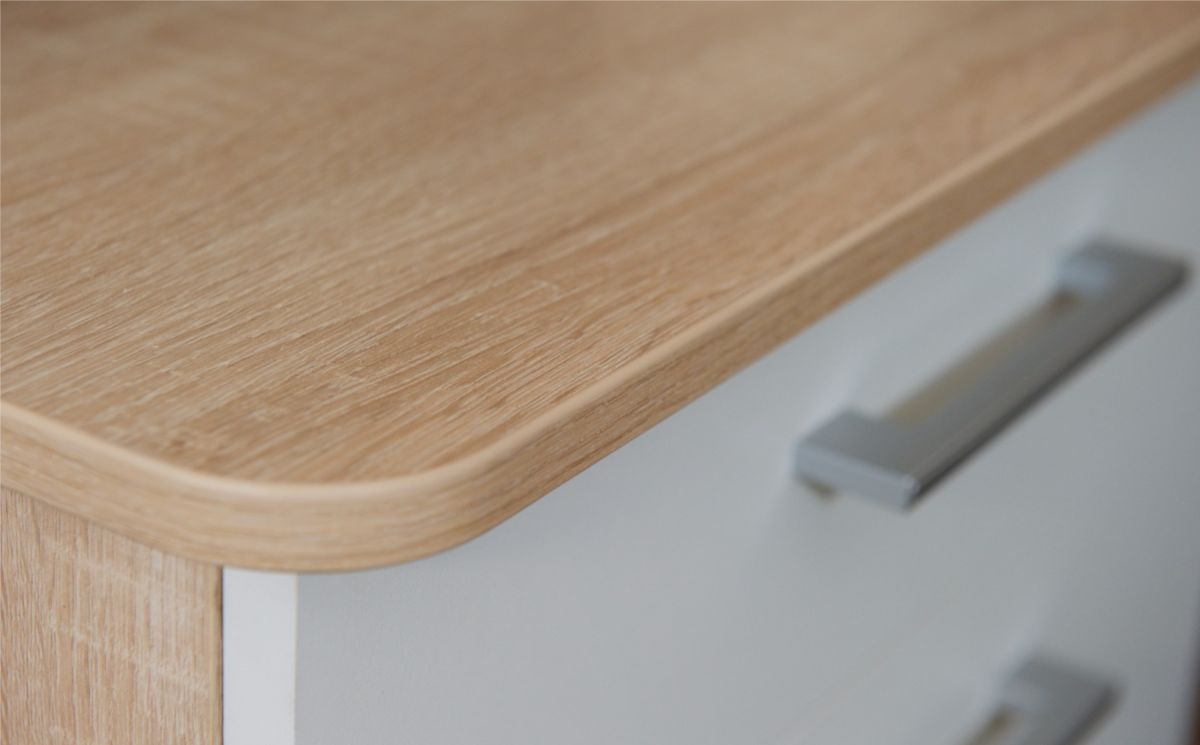 Корпус стола выполнен в тёплом древесном цвете светлого дуба с приятной текстурной поверхностью. Фасады — белые матовые. Нейтральные оттенки мебели позволяют легко интегрировать её в уже существующий интерьер.
