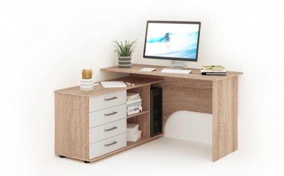 Широкая столешница стола позволяет удобно разместить на ней монитор, клавиатуру и документы. Угловая часть стола предназначена для оргтехники. В столе предусмотрено место для системного блока и письменных принадлежностей.