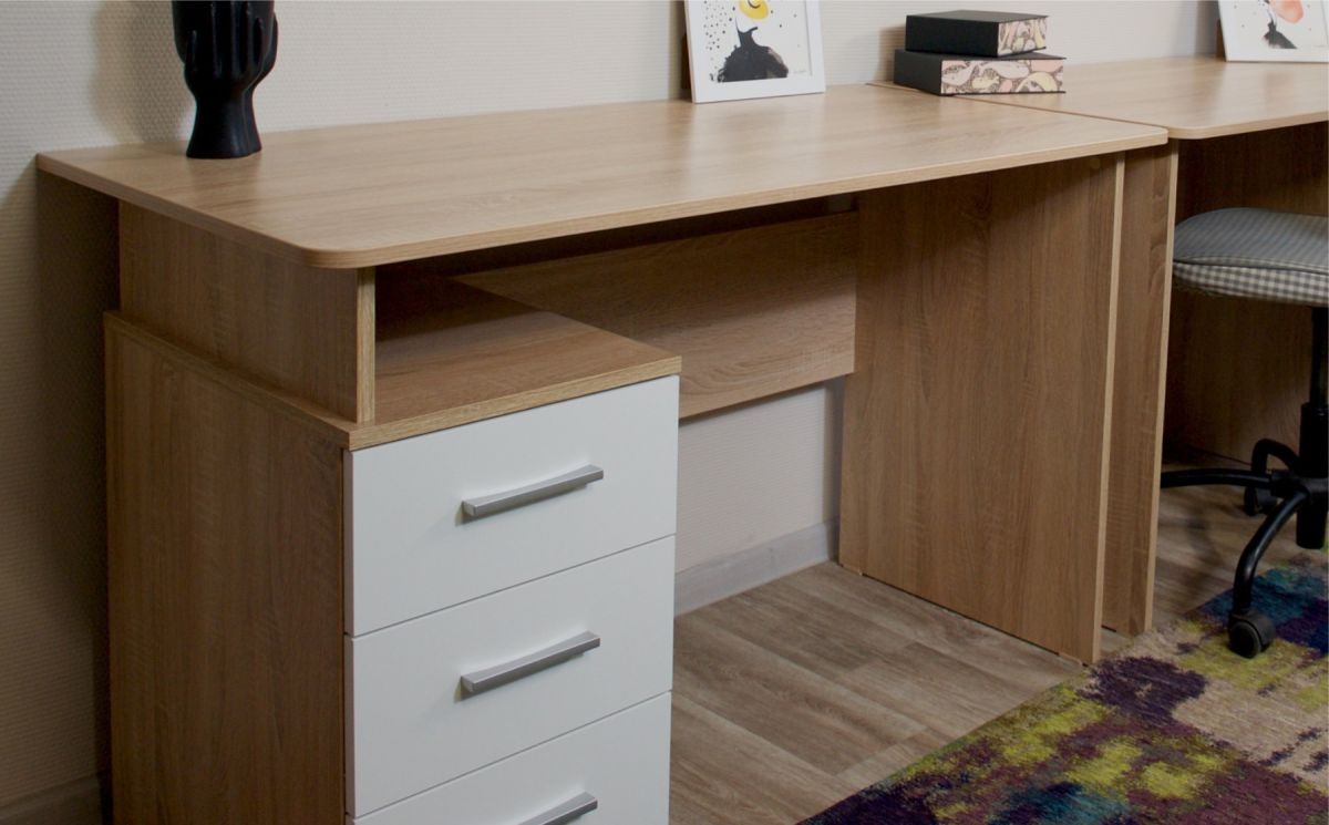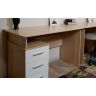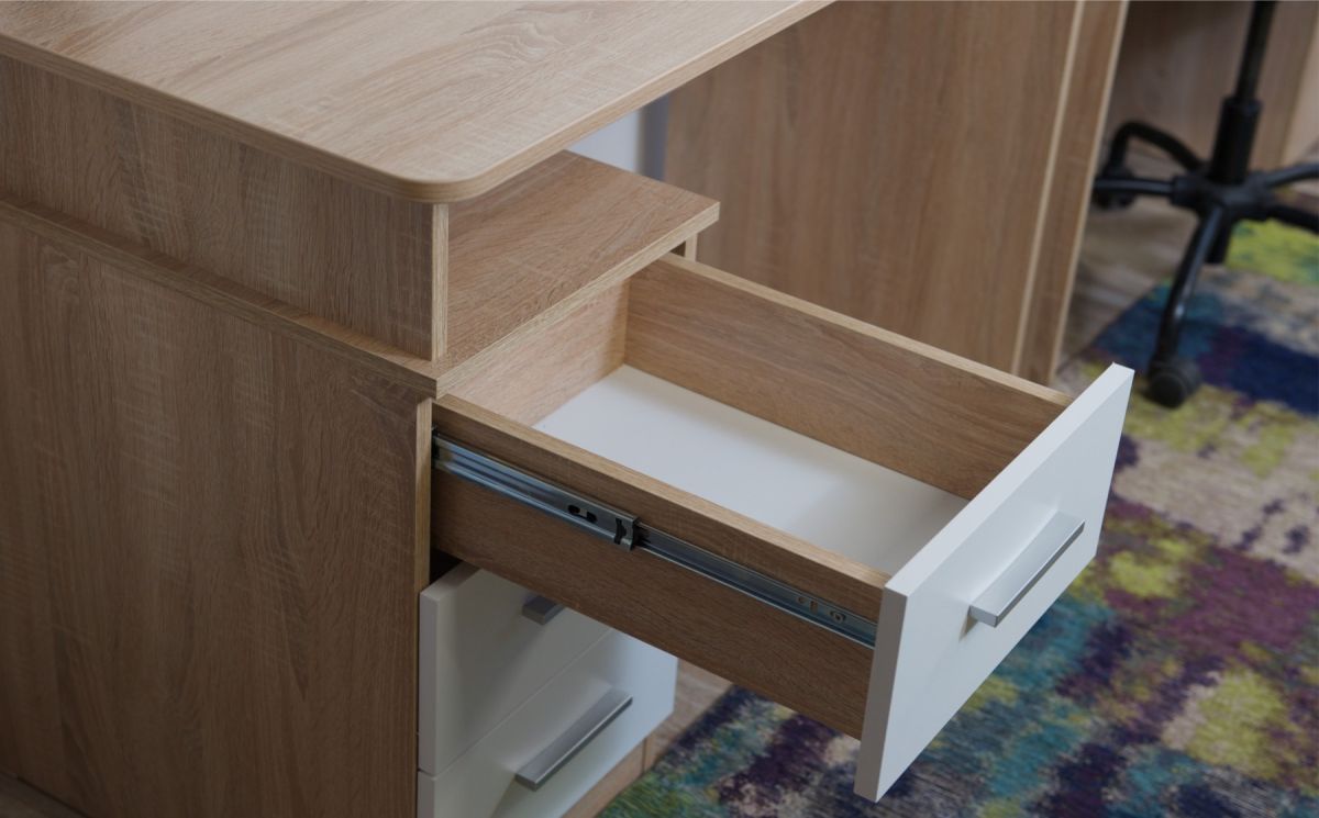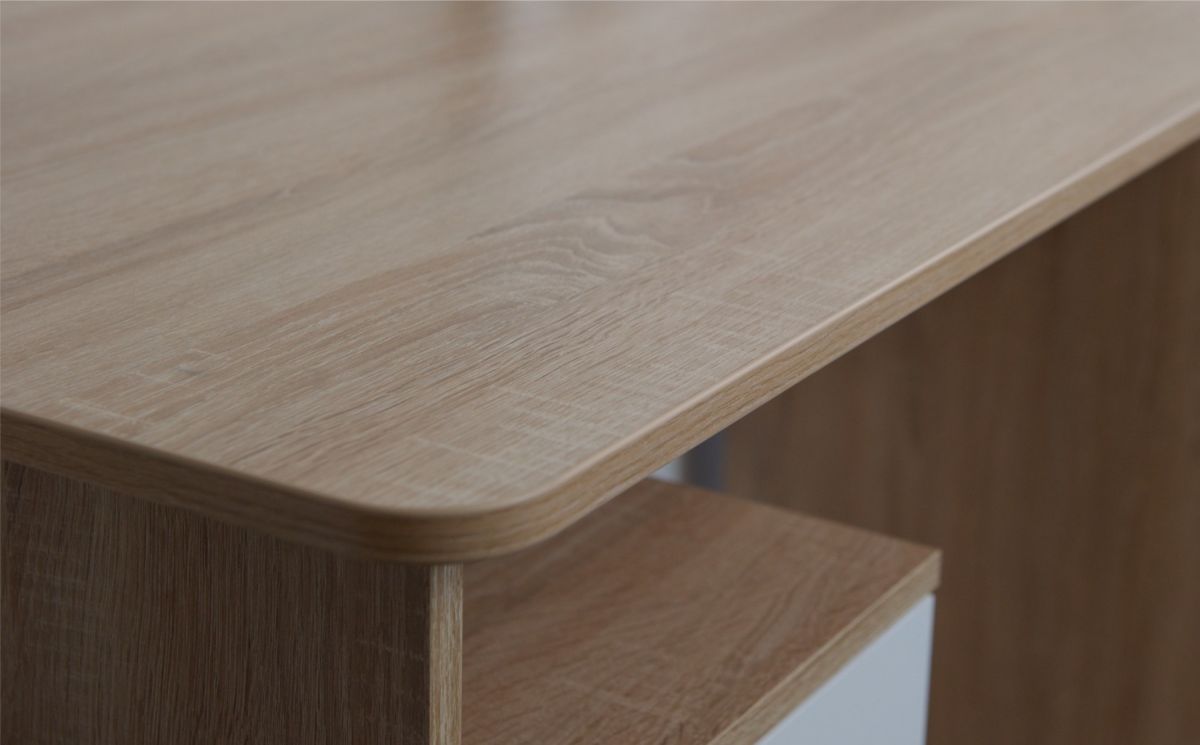 Корпус стола выполнен в тёплом древесном цвете светлого дуба с приятной на ощупь текстурой. Фасады — белые матовые.