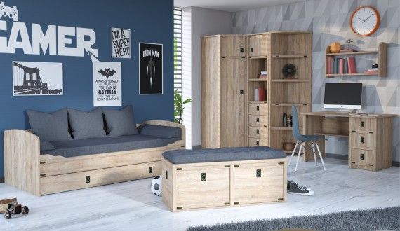 Письменный стол «Валенсия» выполнен в оригинальном морском стиле. Декоративные накладки из МДФ, стилизованные металлические ручки MARINE бронзового цвета и подходящие по тону декоративные элементы создают имитацию корабельной мебели.