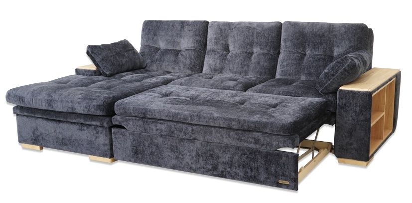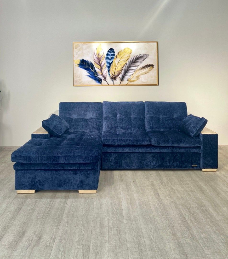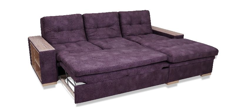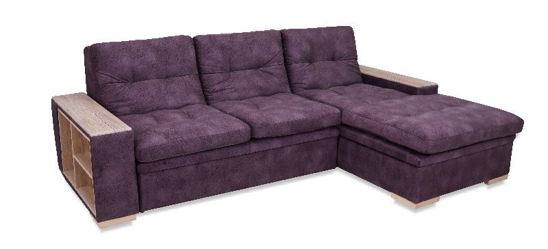 Удобный диван, комфортное спальное место. В подлокотнике со стороны дивана встроенные полочки, со стороны оттоманки —без полок. Большой ящик внутри